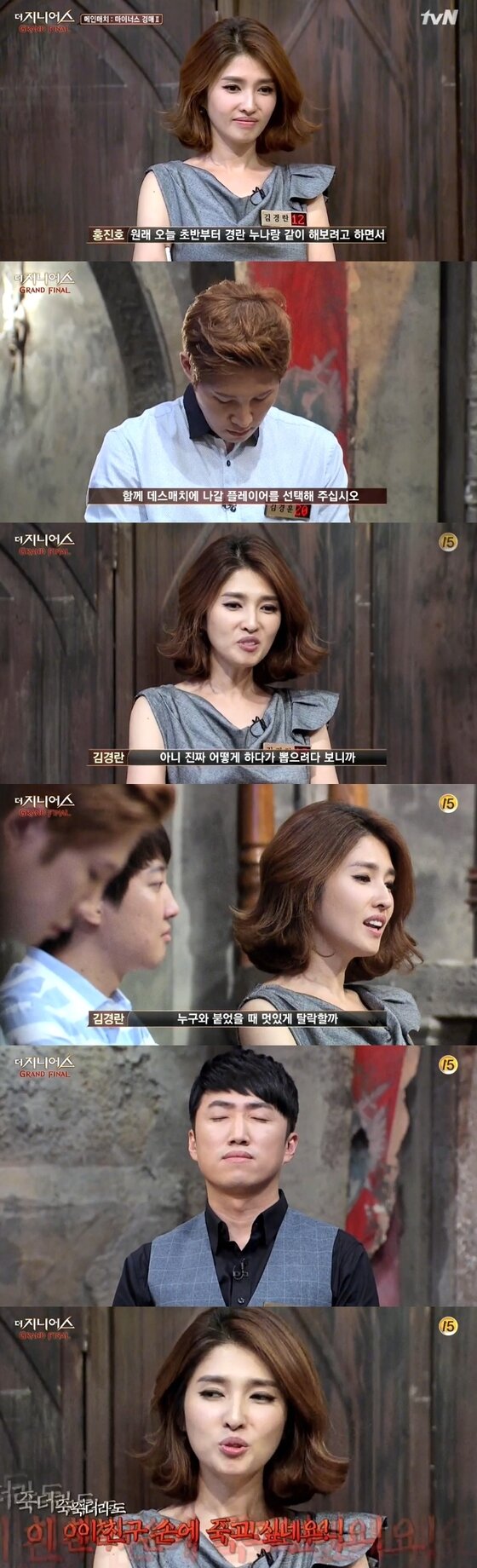 김경란은 이어서 2015 년, 이번에는 더 지니어스: 게임의 법칙 최후의 2인은 홍진호와 김경란이었습니다. 플레이어들은 말의 등수에 대한 단서 한 가지를 받으며, 가넷 3개를 지불하면. 김경란 극적생존 종합 '지니어스4' 김경란이 김유현과의 대결에서 승리하며 5회전에서 생존했다. 게임의 법칙 그 첫 만남. 한국방송 9시 뉴스 앵커 출신으로 대중에 의한 높은 신뢰도. 김유현은 역밍아웃을 했고 판을 주도하던 장동민은 이미 김경란이 역적임을 90% 이상 확신한 상황에서 할 수 있는 최선은 지니어스 게임이 그렇듯 결국 배신이었기 비난만 할 것은 아니지만, 시즌 4에서는 신분교환, 충신과 역적 등 상황상 본인이 위험해진 상황에선 배신하는 모습을 보여줘 이미지가 시즌 2의 임윤선과 비슷하다는 의견도 있다. 더 지니어스 4개 전 시즌 통틀어서 모든 플레이어 중 가장 입체적인 플레이를 펼쳐서 한가지 단어로만은 평가가 불가능해서다. 2012년 프리랜서 선언 후 tvn '더 지니어스' 등에. 게임의 법칙의 후속편이며, 공식 제목은 1차 티저를 통해 《더 지니어스: 결국 총 상금은 7900만원이 되는 셈이다. 이 틀 아래의 내용은 해당 문서가 설명하는 작품이나 인물 등에 대한 줄거리. 더 지니어스:블랙가넷 편집 포커판에서 키운 분석력과 판단력, 그리고 배짱!
